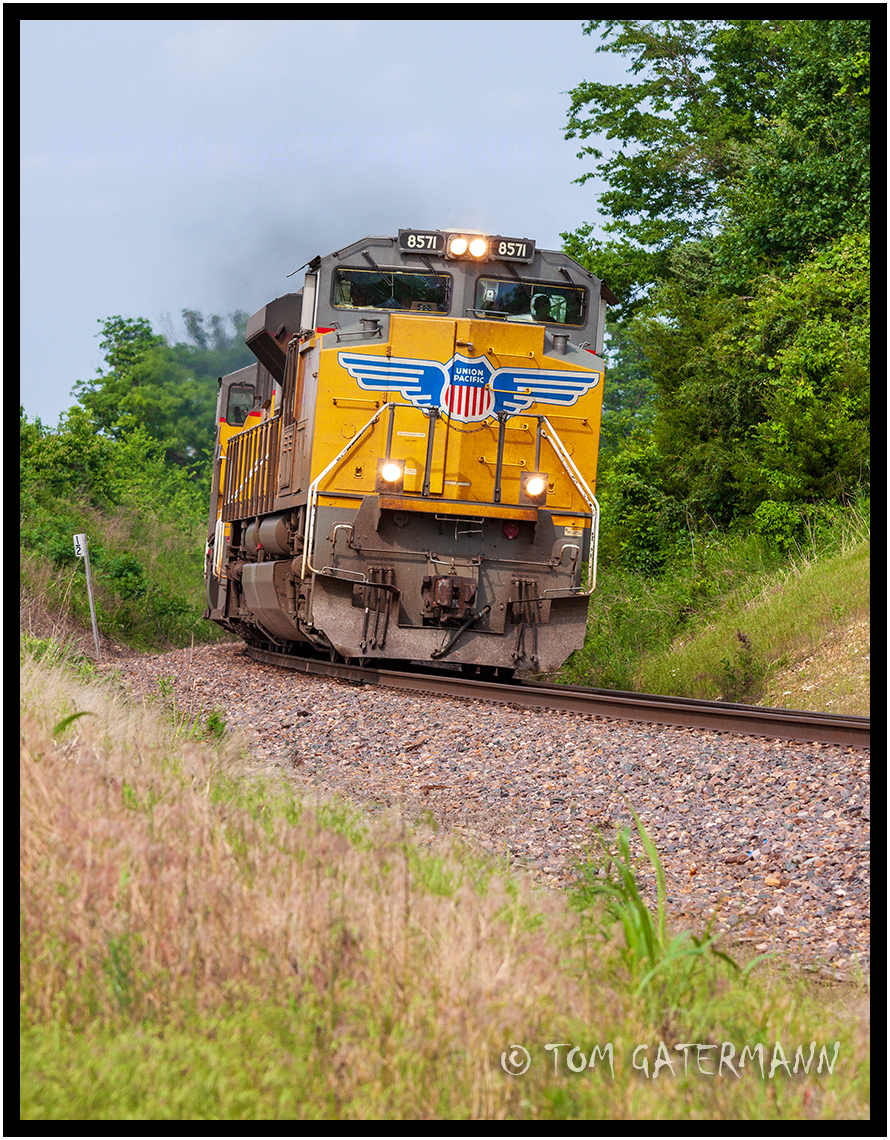 UP 8571 Rounding the Curve at Centertwon, MO.